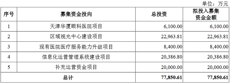 华厦眼科招股书(上会稿)显示,本次华厦眼科本次拟公开发行股票6000万股,占本次公开发行后总股本的10.71%,拟募集资金7.79亿元,用于投入建设天津华厦眼科医院项目(6100万元),区域视光中心建设项目(2.30亿元),现有医院医疗服务能力升级项目(8400万元),信息化运营管理系统建设项目(2.04亿元)以及补充流动资金(2.00亿元)。