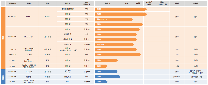 具体而言,公司核心产品MSB2311已向国家药监局提交1期结束分析报告,并于2021年1月获准对TMB-H实体瘤患者进行2期试验。此外,还有四项主要产品:TST001、ST005、TST004及TST002,除唯一授权引进的候选药物Blosozumab(TST002)外,其余均为自主研发。