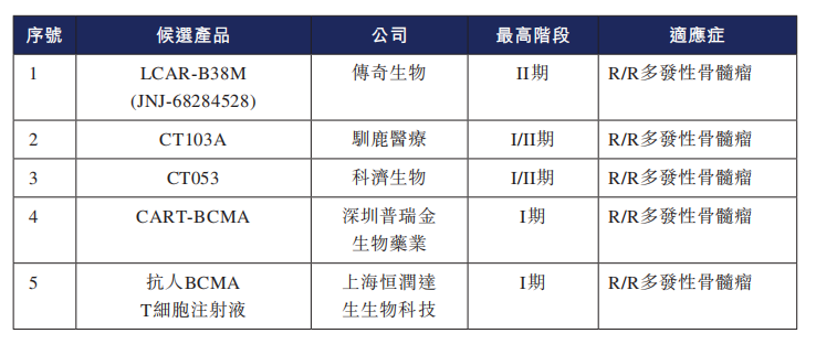 而在中国进行临床试验的候选产品中,传奇生物及杨森开发的JNJ-4528进展较快,在II期临床阶段。同时,传奇生物已就JNJ-4528向美国FDA递交BLA(生物制品上市申请)。