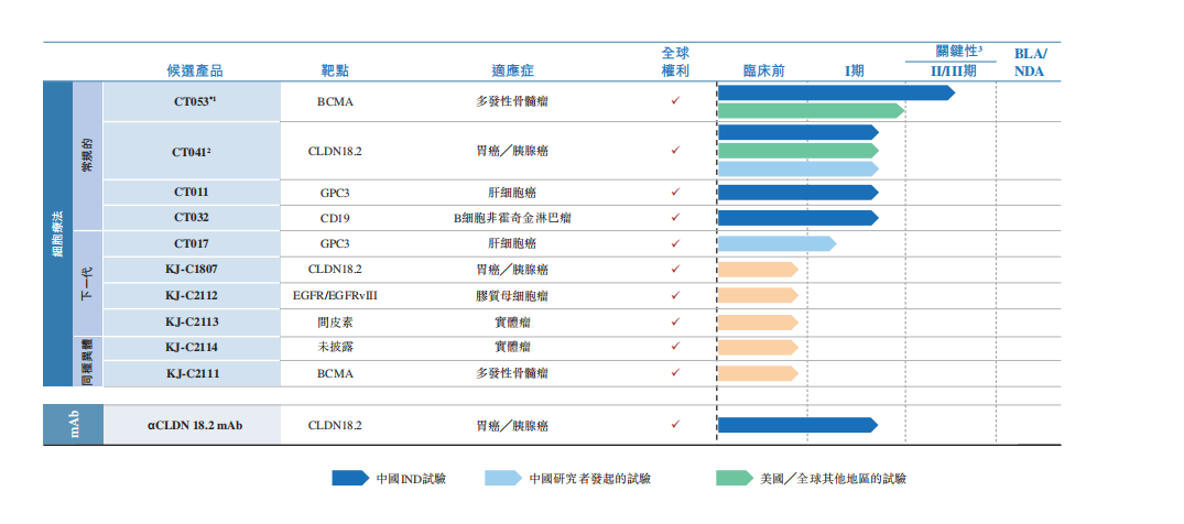 招股书显示,目前,科济药业已开发11款候选产品的差异化管线,其中6个正处于临床阶段。在11个候选产品中,10个是CAR-T细胞疗法,其中5个处于临床阶段。除CT053、CT032及KJ-C2111外,科济药业管线中的所有其他候选产品均用于治疗实体瘤,正处于Ib期临床试验或更早阶段,主要用于治疗胃癌、胰腺癌和肝细胞癌等。