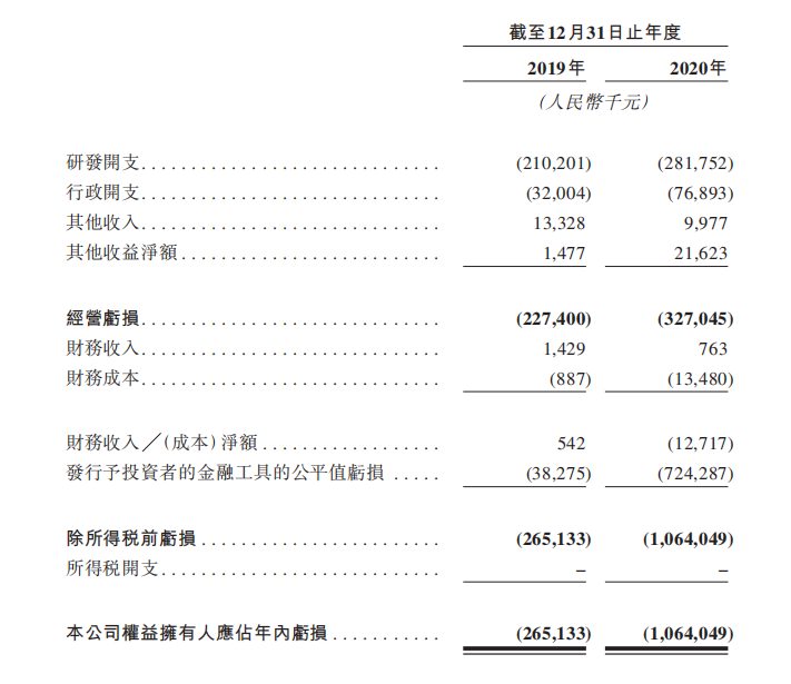 不过,由于科济药业并没有获批的可以商业化销售的产品,并且资金需要用于研发及行政开支,目前,该公司尚处于未盈利状态。根据招股书,截至2019年及2020年12月31日止年度,公司分别亏损2.27亿元和3.27亿元。其中,这两年的研发费用分别为2.10亿元、2.82亿元,截至2020年末,科济药业累计亏损18.22亿元。
