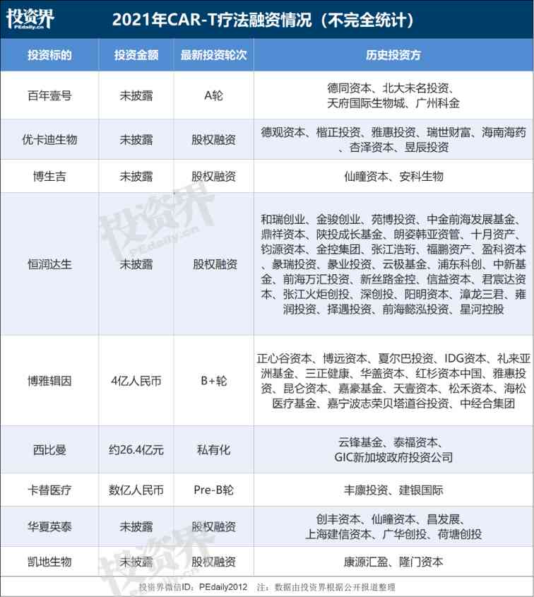 据投资界不完全统计,2021年来,CAR-T疗法有10家左右的公司获得融资,投资轮次涵盖A轮到股权融资。其中,最为火爆的项目之一当属博雅辑因。成立至今,共历经8轮融资,最新一轮为B+轮,吸引了红杉中国基金、礼来亚洲基金、IDG资本、华盖资本、正心谷资本、夏尔巴资本、博远资本等知名投资机构。可见,VC/PE争抢凶猛。