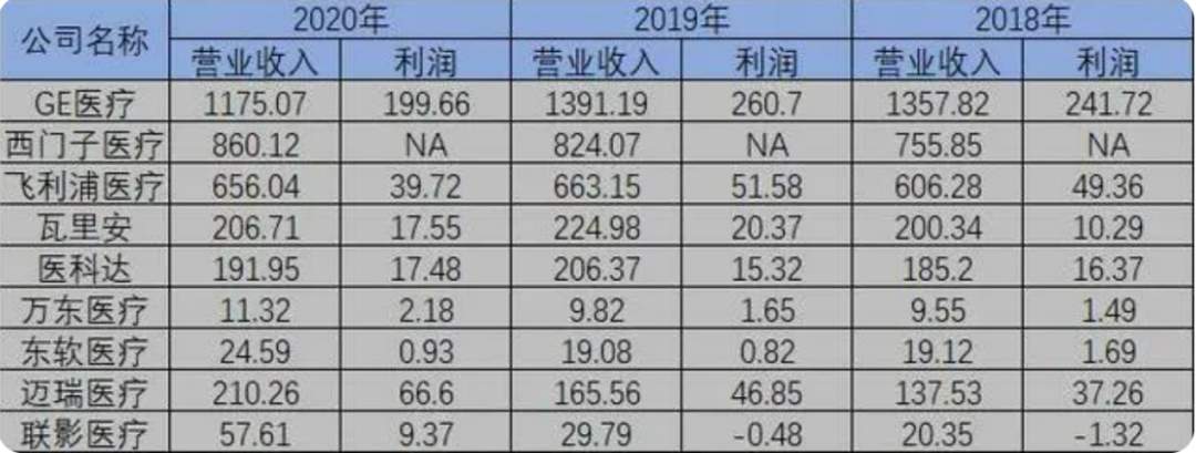 据《21世纪经济报道》称,从国内市场来看,我国高端医学影像设备市场过去一直被GE医疗、西门子医疗和飞利浦医疗等外资企业垄断。而从联影IPO招股书的数据来看,GE医疗在2020年营收到达1175亿元,而联影医疗的营收只有57.61亿元,另一家迈瑞医疗的营收也只有210.26亿元,像万东医疗和东软医疗的同期营收更是不及GE医疗的零头。