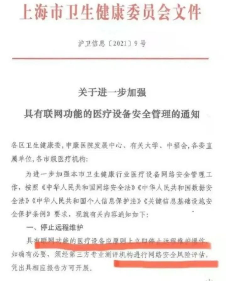 而从上海卫健委发布的文件来看,此事或非捕风捉影。文件明确要求有关部门做好医疗设备安全管理。目前在国内一些信息安全问题上,保持些警惕心理并不为过,无论从医学伦理上,还是数据安全角度上,信息安全是关乎国家安全层面的大问题。