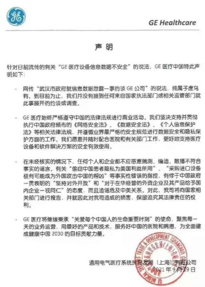 2021年9月被外界质疑“GE医疗信息安全问题”,GE医疗第一时间作出回应,回应称网传“武汉市政府就信息数据泄露一事约谈GE公司”的说法,纯属子虚乌有。GE医疗中国未接到任何来自执法部门或相关监管部门就此事展开的约谈或调查。同时GE医疗中国强调,始终严格遵守中国的法律法规进行商业活动,并遵循业界最严格的安全规范进行数据安全和隐私保护方面的工作,随时配合医院和有关部门工作。