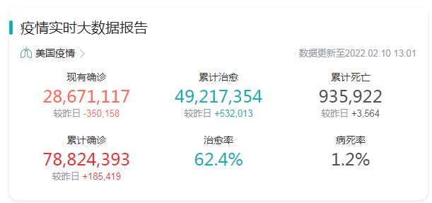 在疫情的影响下,很多行业遭受重创,但医疗设备行业却迎来爆发式增长。以美国疫情情况为例,截至2022年2月10日13时(北京时间)美国已累计确认新冠感染者7882万人,累计死亡94万人。