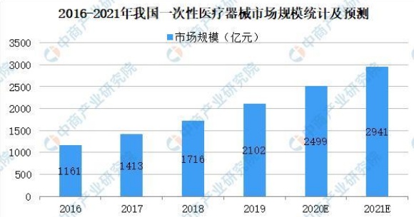 据中国产业研究院统计数据,2019年,中国一次性医疗器械市场规模达2102亿元,2021年中国一次性医疗器械市场规模达到2941亿元。