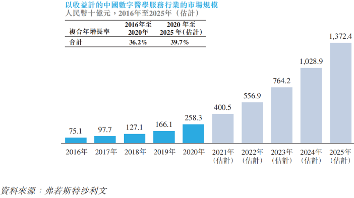 据弗若斯特沙利文的估计,在数字化趋势的推动下, 2020年中国数字医学服务市场规模达2583亿元,到2025年将达到1.37万亿元,复合年增长率将达到39.7%。