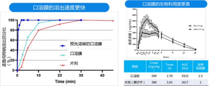 对于全身作用的药物来说,口溶膜剂型可以经口腔黏膜直接吸收,有效避免了药物的首过效应和胃酸的降解作用;研究数据表明:口溶膜剂型孟鲁司特钠相较于进口原研孟鲁司特钠片,溶出速度更快,生物利用度更高,起效更迅速。