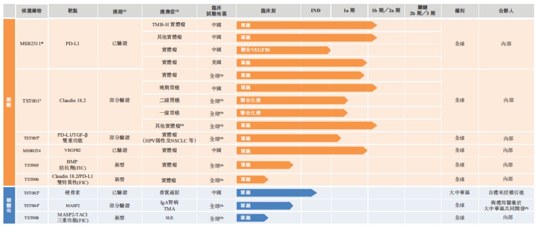 此外,创胜集团还有四种主要产品:TST001(一种人源化Claudin 18.2靶向抗体)、TST005(一种人源化PD-L1/TGF-β双重功能抗体融合蛋白)、TST004(一种人源化MASP2靶向抗体)及TST002(一种人源化硬骨素靶向抗体)。MSB2311、TST001、TST005及TST004均由创胜集团自主开发。