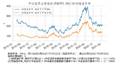 当前中证医药主题指数相对于全市场代表指数沪深300、中证全指的估值溢价率,已经从2020年7月的400%、250%左右,分别回落至210%、140%左右。结合医药行业所具有的较强成长性、景气度,当前时点或已具备投资价值。