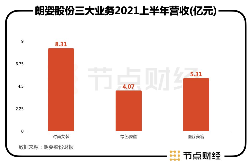 再看朗姿股份三大业务占比:时尚女装2021年上半年收入8.31亿元,同比增长60.55%,占营收46.46%;绿色婴童收入4.07亿元,同比增长21.86%,占营收22.77%;而万众瞩目的医疗美容业务,收入5.31亿元,同比增长49.85%,占营收29.67%。