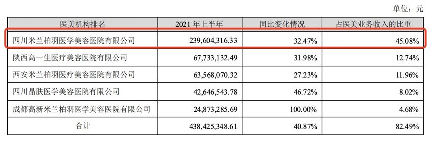 值得注意的是,在22家医美机构中,仅一家单体医院就贡献了公司近半的医美营收,这意味着,朗姿股份对单一机构的依赖严重。其半年报显示,报告期内,四川米兰柏羽医学美容医院收入2.4亿,占医美业务收入比重45.08%。