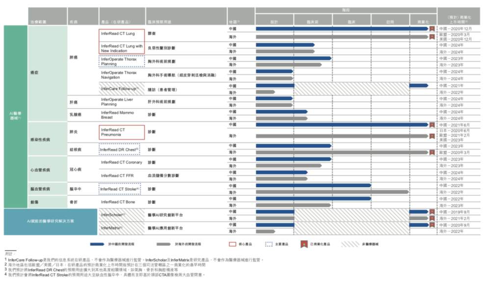 譬如,针对胸外科术前规划的在研产品InferOperate Thorax Planning,计划在2021年底前在中国开展临床试验、2022年上半年前向国家药监局提交第三类医疗器械注册的申请,并预计在2022年下半年获得国家药监局的批文。根据弗若斯特沙利文报告,截至最后实际可行日期,中国并无AI肺部术前规划医疗器械获批,而除InferOperate Thorax Planning之外,在中国仅有一款产品在开发中。