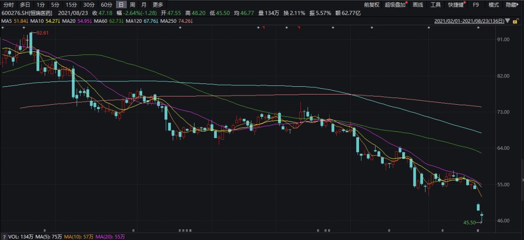 8月23日收盘,恒瑞医药股价定格在47.18元/股,全天下跌2.64%。而就在上周五(8月20日),因当天发布的半年报不及市场预期,恒瑞医药开盘迅速封死跌停,连带整个医药、医疗保健板块“崩盘”。