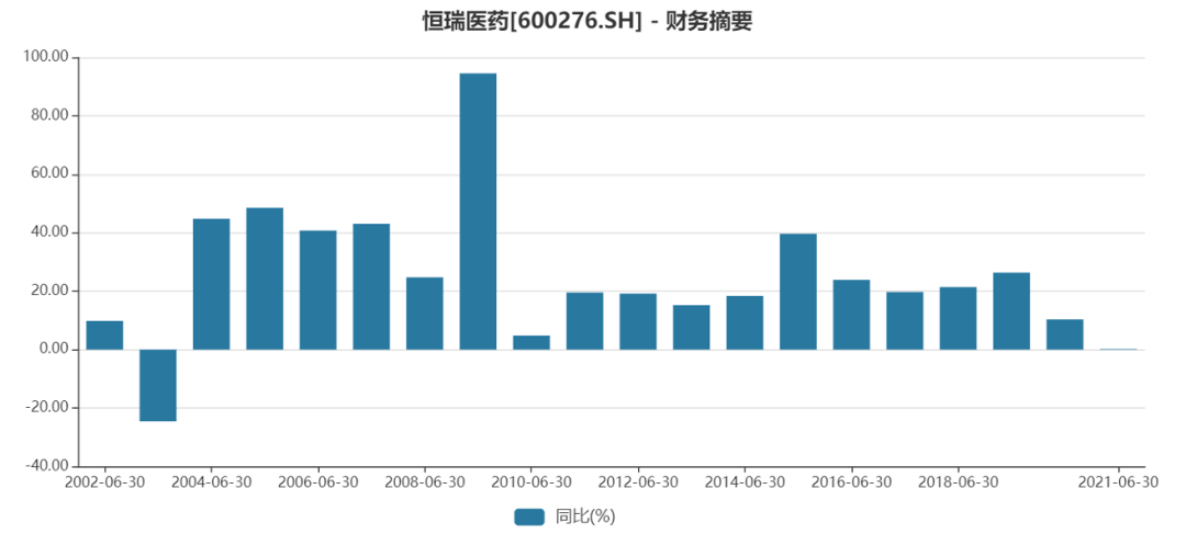 节点财经查阅其历年半年报发现,除了2003年归属净利润下降24.56%,2010年归属净利润增长4.81%,恒瑞医药在其余年份的净利润增速均保持在两位数以上。