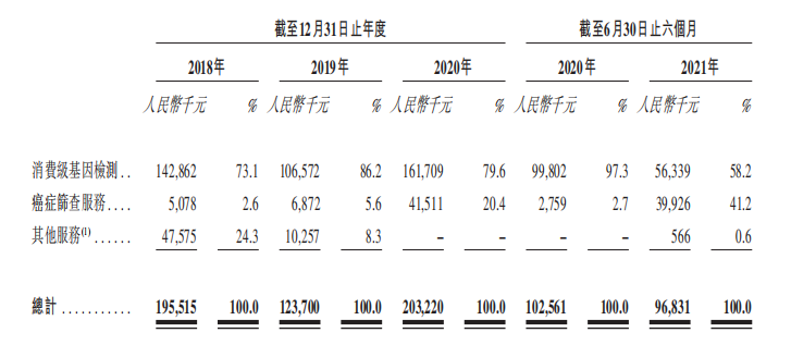 招股书显示,美因基因也是全国最大的肿瘤筛查平台。2018至2020年及2021年上半年,公司的癌症筛查服务收入分别为510万元、690万元、4150万元和3990万元。截至2021年6月30日,消费级基因检测和癌症筛查服务收入占比为58.2%和41.2%。