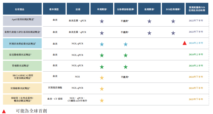 同时,美因基因投入自研的IVD管线,现包括3种消费级基因检测产品和5种疾病筛查产品,前3种分别为叶酸代谢能力评估检测试剂盒,可用于评估患多种心脑血管疾病的风险;ApoE基因检测试剂盒,可用于评估患阿尔茨海默症的风险;BRCA1/BRCA2基因突变检测试剂盒,可用于评估患遗传性乳腺癌的风险,后一类型试剂盒包括阿尔茨海默症筛查试剂盒、结肠癌筛查试剂盒、胃癌筛查试剂盒、肺结节辅助诊断试剂盒及宫颈癌筛查试剂盒。