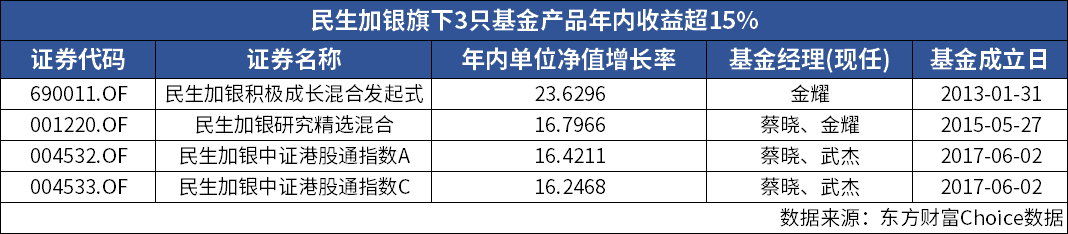 而民生加银基金旗下年内收益超过15%的基金产品分别为金耀、蔡晓、武杰等基金经理管理。