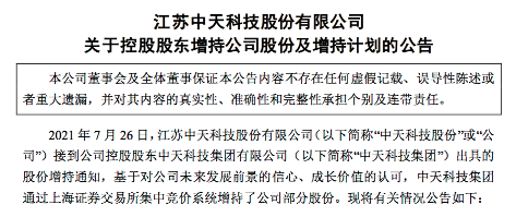三是控股股东增持,7月26日,中天科技公告称,接到公司控股股东中天科技集团出具的股份增持通知,基于对公司未来发展前景的信心、成长价值的认可,中天科技集团通过上海证券交易所集中竞价系统增持了公司部分股份。中天科技集团增持了566万股,耗资4220.36万元,增持股份占公司总股本比例为0.18%。