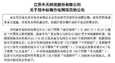 中天科技在7月29日公告,公司及控股子公司中天铝线、江东金具、中天海缆、电缆附件,中标南方电网公司2021年主网线路材料第一批框架招标项目。公告表示,本次预中标南方电网项目巩固了公司在电力传输行业的领先地位,增强中天科技品牌在输配电领域的影响力和核心竞争力。本次预中标金额合计约8.97亿元,项目的执行将对公司当期及后期经营业绩产生积极影响,有利于提升公司整体盈利能力。