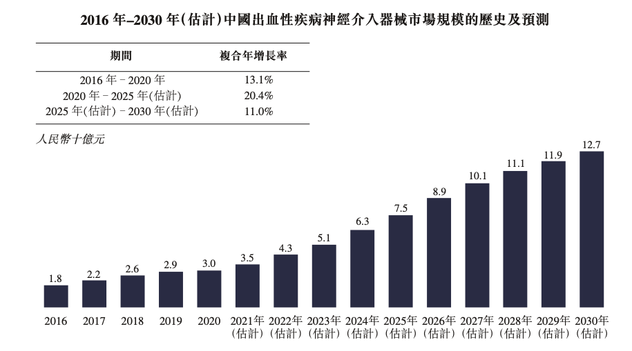 庞大的患者群体意味着海量的市场份额,中国出血性疾病神经介入器械市场规模从2016年的人民币18亿元增至2020年的30亿元,复合增长率达到13.1%,未来5年市场将迎来20.4%复合增长率,爆发扩容至75亿元,预计2030年整体升至130亿元水平。
