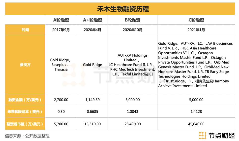 此后,禾木开始引入资本,补给弹药。2017年9月至2021年1月之间,禾木完成了A轮、A+轮、B轮和C轮四次融资,共获资金约1.38亿美元,参投机构包括高瓴、三正、君联、礼来等十余家投资机构。