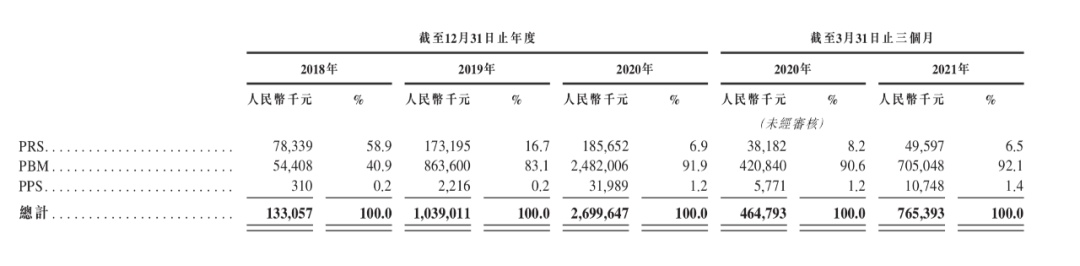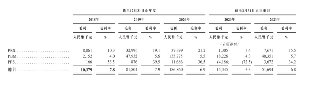 当然,从毛利率来看,作为收入最主要来源的PBM业务毛利率并不高,2018年至2020年、以及2021年第一季度的毛利率分别为4.0%、5.6%、5.5%和5.7%。相较之下,PPS的毛利率最高,其在2018年至2020年、以及2021年第一季度的收入占比分别为0.2%、0.2%、1.2%和1.4%。