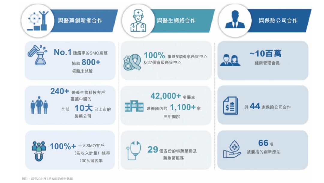 根据灼识咨询的资料,按2020年全年收入计算,思派的PRS拥有最大的肿瘤临床试验现场管理组织(SMO),PBM则拥有最大的私营特药药房。截至2021年6月30日,思派通过其在中国100多个主要城市的医院、全科医生与专家的供应商网络合作伙伴为近一千万名加入其健康保险计划的会员提供PPS。