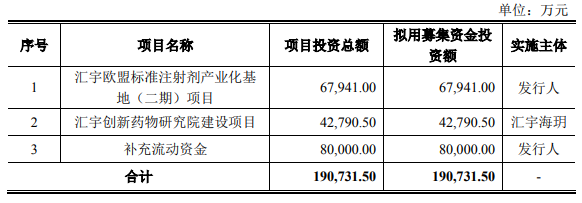 汇宇制药招股书显示,本次汇宇制药计划发行不超过6360万股人民币普通股,拟募集资金19.07亿元,用于投入建设汇宇欧盟标准注射剂产业化基地(二期)项目 (6.79亿元),汇宇创新药物研究院建设项目(4.28亿元)以及补充流动资金(8亿元)。