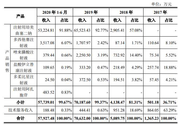 公开资料显示,汇宇制药主要从事抗肿瘤和注射剂药物的研发、生产和销售,是一家研发驱动型的综合制药企业,主要产品包括注射用培美曲塞二钠、多西他赛注射液、唑来膦酸注射液等。其中,注射用培美曲塞二钠产品逐渐成为汇宇制药收入最大来源,截至2020年上半年该项产品营收占比已经达到91.88%,单一产品依赖性凸显。