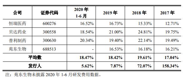 不过从近年研发投入数据来看,汇宇制药研发费用率呈现逐年下滑的趋势。截至2020年上半年,汇宇制药研发费用率为5.62%,远远低于行业均值18.47%;与2017年的158.34%相比也呈现跳水式下滑。