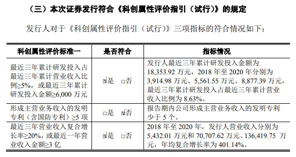 再从招股书所披露的科创属性评价情况来看,汇宇制药并未符合《科创属性评价指引(试行)》中的“形成主营业务收入的发明专利(含国防专利)≥5项”标准,仅有4项专利且均在2019年之前取得,未完全契合科创属性评价标准,科技创新能力略有不足。