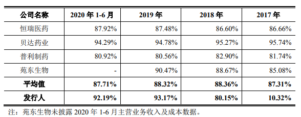 2017年-2020年上半年,汇宇制药主营业务毛利率分别为10.32%、80.15%、93.17%及92.19%,2018年以来毛利率水平呈现高位水平。截至2020年上半年,汇宇制药主营业务毛利率为92.19%仅次于贝达药业(300558.SZ),不仅高于行业平均值,与同业可比公司来看也颇具优势。