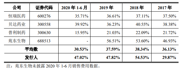 与同行业对比来看,汇宇制药的销售费用着实偏高,截至2020年上半年,汇宇制药销售费用率为47.02%,远高于行业平均值30.53%。