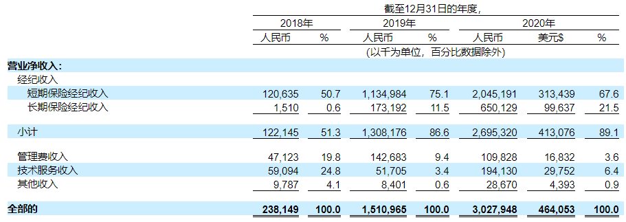 根据招股书内容,水滴公司的营业净收入主要来自向保险公司提供多个保险经纪服务,也就是由水滴保业务贡献。2018年、2019年、2020年经纪收入分别占到了总营收的51.3%、86.6%和89.1%。而水滴筹业务,水滴公司不收取任何费用,所以未对营收做出直接贡献。