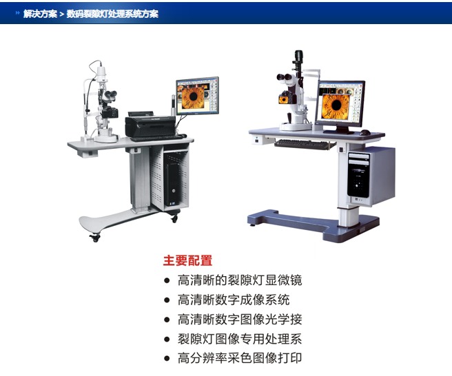 包括裂隙灯系列、分光器系列、综合验光仪、DICOM 打印系统、眼科自助打印系统、倒像镜、液晶视力表、三维医院 DICOM 打印系统、数字眼科 PACS系统、裂隙灯智能采集互动系统、高清 3D 手术录播系统、手持裂隙灯。