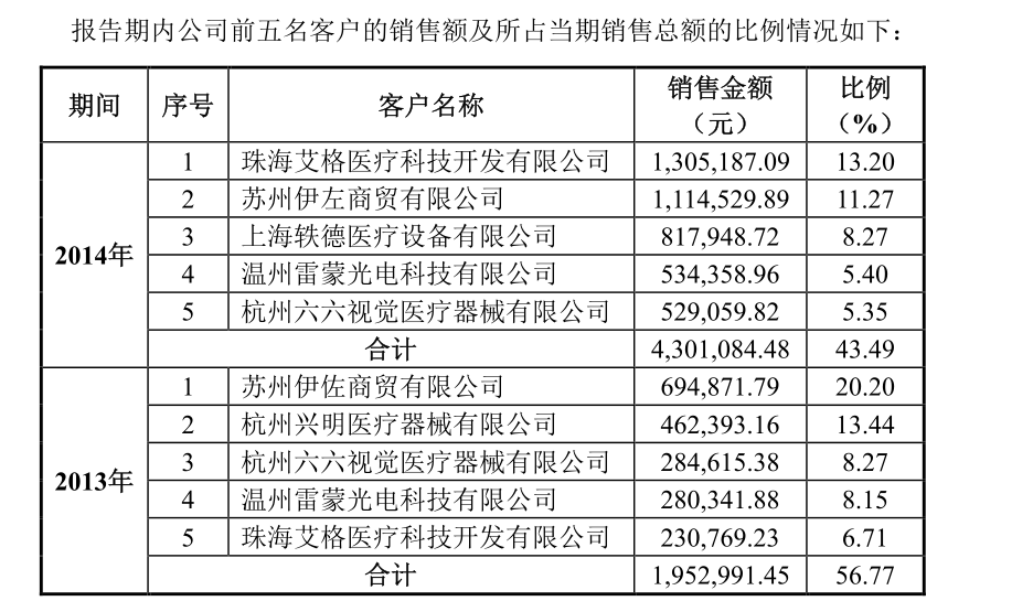 客户主要是眼科医疗器械企业,比如2016年,昊海生物科技(股票代码:6826.HK)旗下的艾格医疗 、轶德医疗(OC:839056)、康捷医疗(430521.OC )、鱼跃医疗(SZ:002223)旗下的杭州六六视觉医疗器械有限公司等,还有嘉兴市第一医院 、宁波市鄞州第二医院、内蒙古自治区红十字会包头朝聚眼科医院等医疗机构。