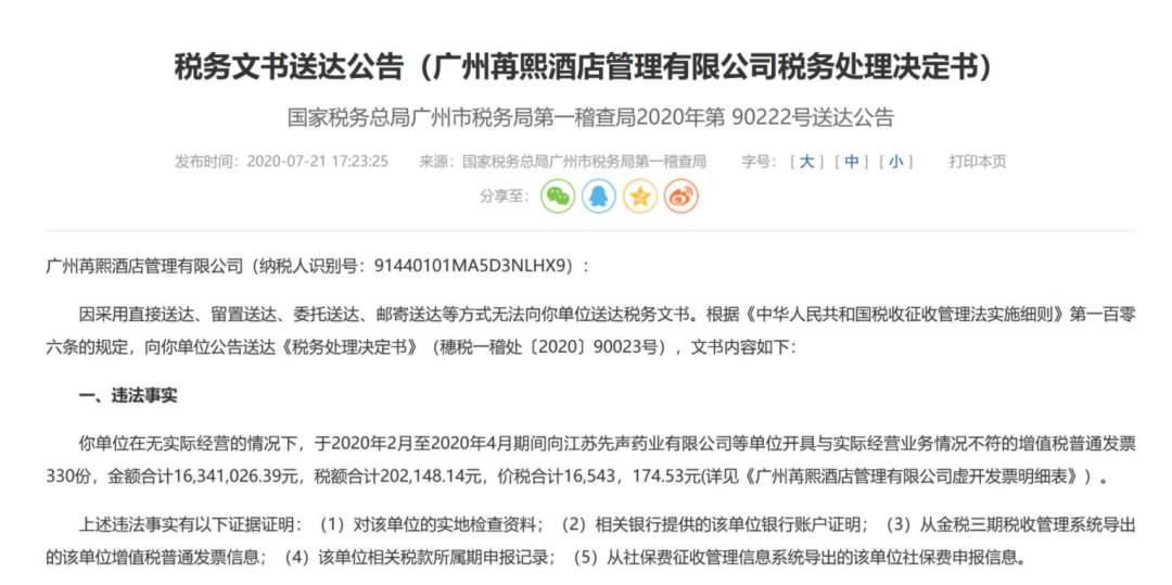 根据广州税务局于2020年7月21日发布的两份税务文书送达公告,广州苒熙酒店管理有限公司金额广州怡先酒店管理有限公司因2020年2月至2020年4月(疫情期间)向先声药业等单位合计开具虚开增值税普通发票价税合计3921.17万元,分别被广州税务局第一稽查局以虚开认定、公告送达税务处理决定。