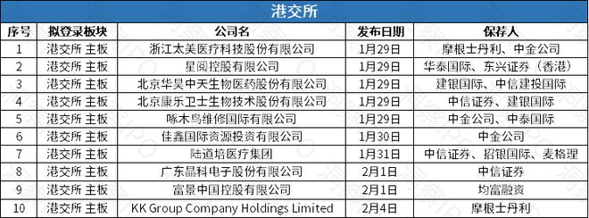 1月29日-2月4日,港交所有10家公司递交主板上市申请。