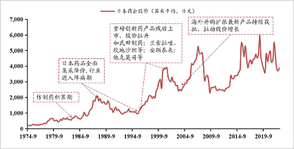 日本药企巨头的发展走在中国前面,主要经历了4个阶段——仿制药积累期,通过仿制药发展壮大;药品全面集采期,医药指数全部被腰斩;本土创新药崛起期,股价摆脱泥沼,开启长达数年牛股行情;创新药出海期,叠加横向并购扩张,成长为国际化药企巨擘,市值不断膨胀。