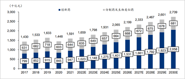 在老龄化不可逆转以及患病率逐渐上升的趋势之下,居民对于医疗器械、药品的需求将会持续增长。据弗若斯特沙利文,2021年中国医药市场规模达15912亿元,且未来还将高速扩容,2025年和2030年分别有望增长至20645亿元和27390亿元。