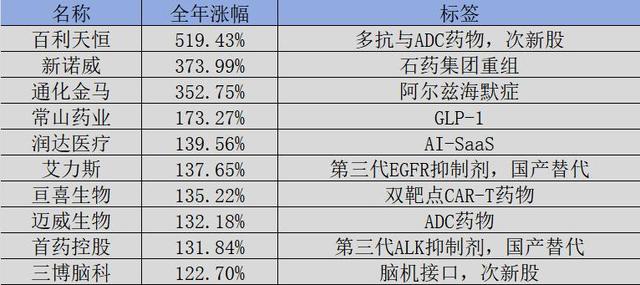 通过对所有A股、港股、美股上市医药公司的复盘,我们盘点出了2023年股价涨幅最高的十家公司:百利天恒、新诺威、通化金马、常山药业、润达医疗、艾力斯、亘喜生物、迈威生物、首药控股、三博脑科。