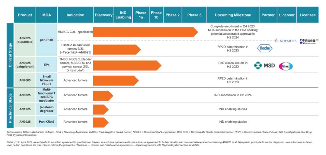 最早可追溯至2004年的阿诺医药作为一家临床阶段的全球性生物制药公司,专注于开发差异化、创新性的肿瘤治疗药物,现产品管线涵盖六种候选药物——三种临床阶段候选药物:AN2025 (buparlisib)、AN0025(palupiprant)和AN4005,以及另外三种临床前候选药物。