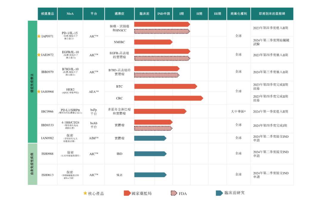 IAE0972是一种自主研发的潜在同类首创抗EGFR抗体-IL-10同源二聚体双功能融合蛋白,用于激活免疫细胞。与IAP0971一样,IAE0972亦预期通过抗体靶点和细胞因子有效载荷的不同组合,利用抗体细胞因子的优势实现协同抗肿瘤活性。这一产品旨在阻断EGFR信号通路,并将IL-10特异性地输送到靶向肿瘤部位,以激活CD8+ T细胞,以及潜在的NK细胞。2021年12月和2022年1月,盛禾生物获得FDA和国家药监局的批准,可在局部晚期或转移性实体瘤患者中进行I/II期临床试验,并预计在今年第四季度进行IAE0972的II期临床试验。