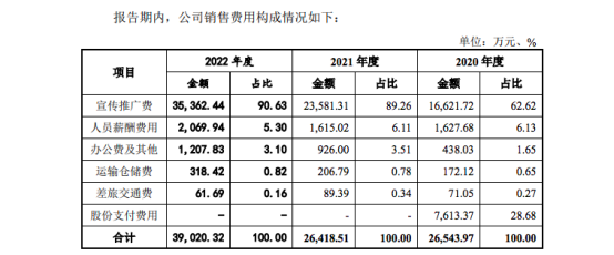 其中的宣传推广费,也即营销费用增长最快。2019-2022年,公司宣传推广费分别达到0.7亿元、1.66亿元、2.36亿元和3.54亿元,占据销售费用比重分别高达60.93%、62.62%、89.26%和90.63%。