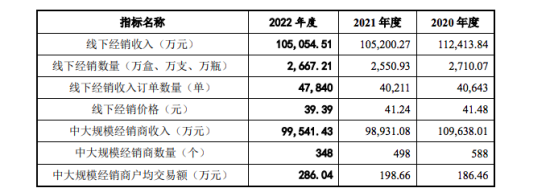 除了线上渠道的业绩下滑,敷尔佳的核心销售渠道,也即占比超六成的线下经销渠道,同样开始走低。2019-2022年,敷尔佳的分级经销商数量分别为1143家、606家、620家、351家。2022年,公司分级经销商数量几乎出现“地板斩”,下滑幅度高达69.29%。