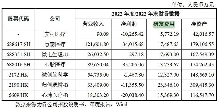 即便如此,艾柯医疗2022年的研发费仍在可比同行中最低。同期,惠泰医疗为1.75亿,微电生理-U为7693万,心脉医疗为1.38亿。