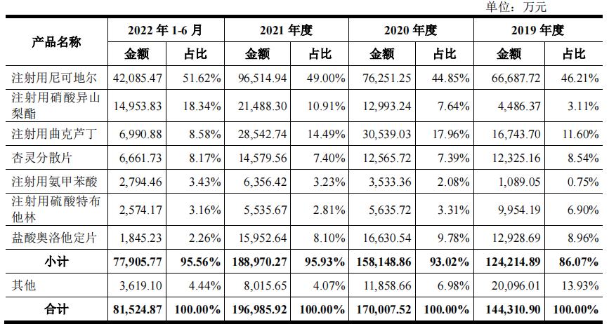 公司主要收入贡献品种包括注射用尼可地尔、注射用硝酸异山梨酯、注射用曲克芦丁、杏灵分散片、注射用氨甲苯酸、注射用硫酸特布他林和盐酸奥洛他定片等。报告期内,上述产品收入合计占主营业务收入的比例分别为86.07%、93.02%、95.93%和95.56%。其中,注射用尼可地尔系公司核心产品,占公司主营业务收入的比重分别为46.21%、44.85%、49.00%和51.62%。