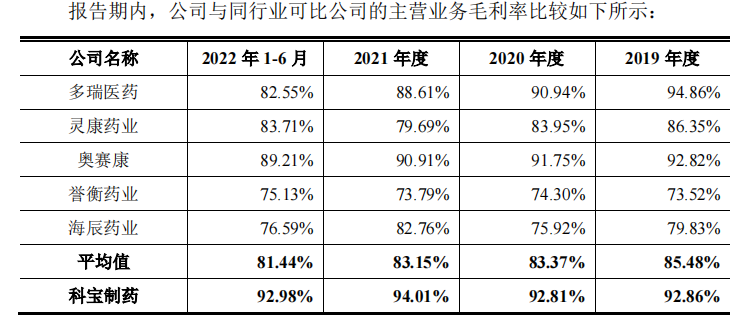 报告期各期,公司主营业务毛利率分别为92.86%、92.81%、94.01%和92.98%,高于同行业可比公司的主营业务毛利率平均值85.48%、83.37%、83.15%和81.44%。
